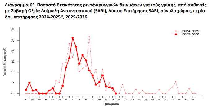 Συνολικά, από την εβδομάδα 40/2025 έως την 15/2026 έχουν καταγραφεί 162 σοβαρά περιστατικά με νοσηλεία σε ΜΕΘ και 82 θάνατοι, ενώ από την αρχή του 2025 οι θάνατοι σε σοβαρά περιστατικά ανέρχονται σε 166.