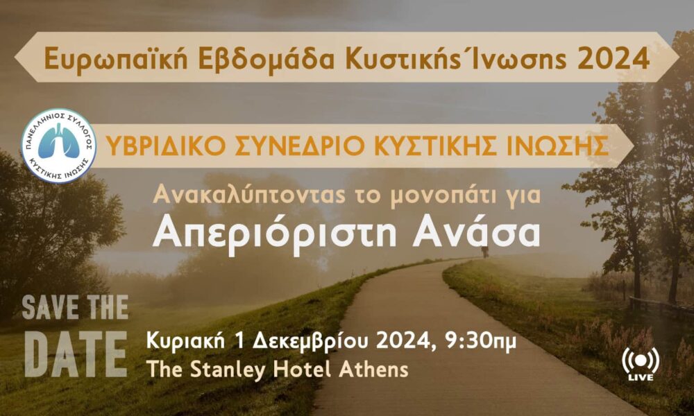 Με αφορμή την Ευρωπαϊκή Εβδομάδα Κυστικής Ίνωσης, 18-24 Νοεμβρίου 2024, ο Πανελλήνιος Σύλλογος Κυστικής Ίνωσης επιχειρεί να παρέχει πληροφορίες και να αφυπνίσει το ευρύτερο κοινό για την πιο συχνή κληρονομική νόσο με περισσότερους από 80.000 ασθενείς στην Ευρώπη. Στο πνεύμα αυτό θα διεξαχθεί το ετήσιο Yβριδικό Συνέδριο, με τίτλο «Ανακαλύπτοντας το Μονοπάτι για Απεριόριστη Ανάσα».