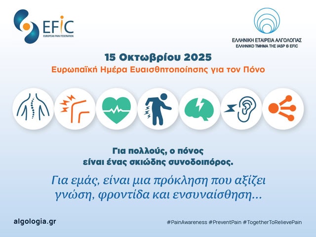 Η 15η Οκτωβρίου 2025 σηματοδοτεί την Ευρωπαϊκή Ημέρα Ευαισθητοποίησης για τον Πόνο, με κεντρικό μήνυμα την ανάγκη για γνώση, φροντίδα και πρόληψη. Η Ελληνική Εταιρεία Αλγολογίας συμμετέχει ενεργά στην πρωτοβουλία της Ευρωπαϊκής Ομοσπονδίας Πόνου, προωθώντας τον διάλογο γύρω από τον χρόνιο πόνο και τις επιπτώσεις του.