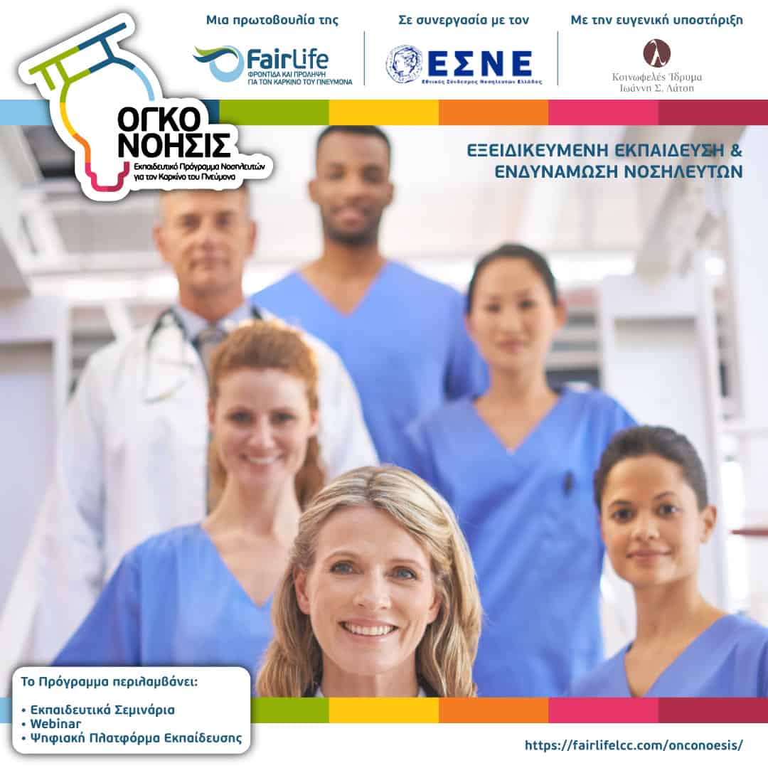 Η FairLife L.C.C. ενισχύει τη νοσηλευτική φροντίδα για ασθενείς με καρκίνο του πνεύμονα στην Ελλάδα, εγκαινιάζοντας το 1ο Εκπαιδευτικό Πρόγραμμα Νοσηλευτών «ΟγκοΝόησις». Το πρόγραμμα πραγματοποιείται με την επιστημονική υποστήριξη του Τομέα Νοσηλευτικής Ογκολογίας του Εθνικού Συνδέσμου Νοσηλευτών Ελλάδος (ΕΣΝΕ).