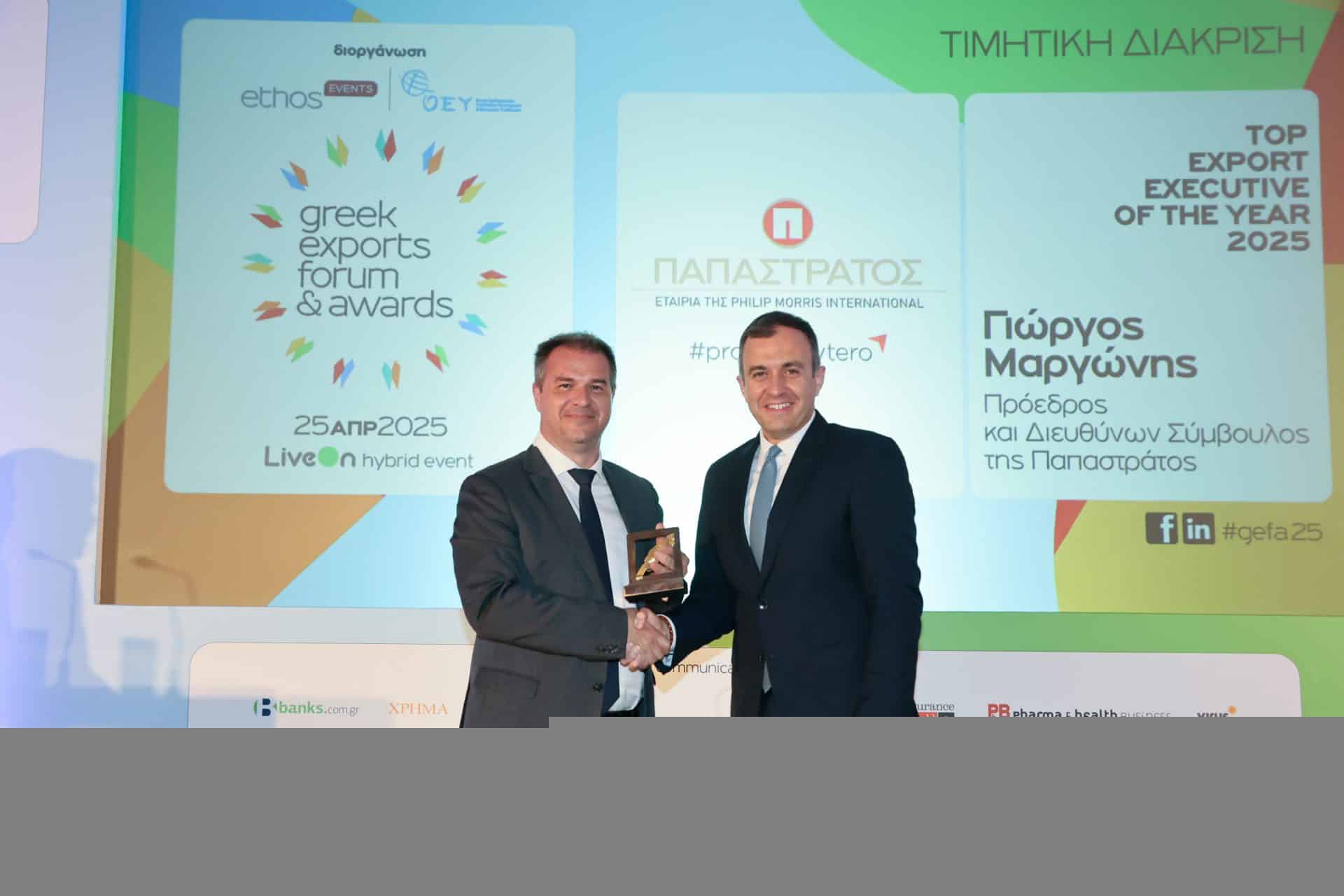 Τη διάκριση Top Export Executive of the Year έλαβε ο κ. Γιώργος Μαργώνης, Πρόεδρος & Διευθύνων Σύμβουλος της Παπαστράτος.