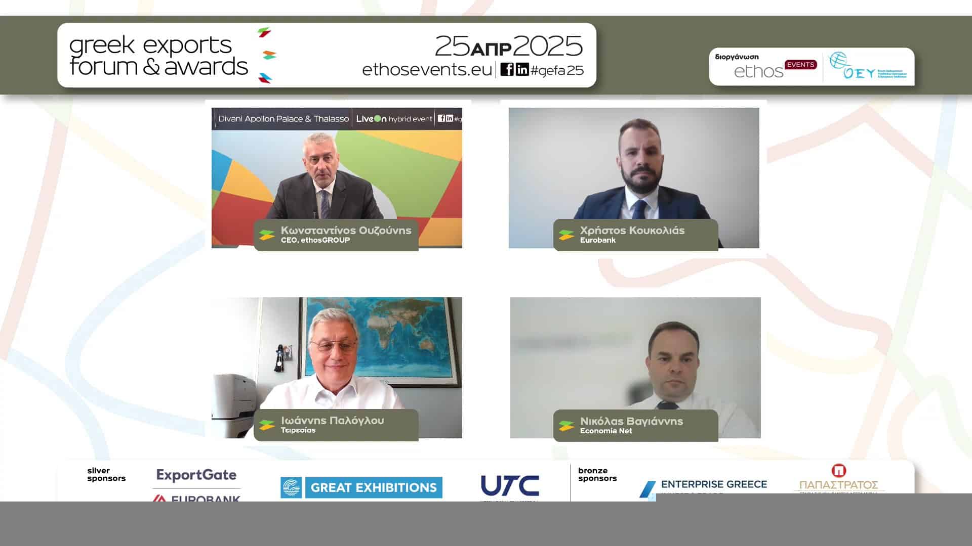 Το Greek Exports Forum πραγματοποιήθηκε το πρωί ψηφιακά, μέσω του LiveOn Expo Complex, του καινοτόμου 3D εκθεσιακού και συνεδριακού κέντρου της LiveOn, της Ψηφιακής πλατφόρμας Επιχειρηματικής Επικοινωνίας και Εκδηλώσεων, ενώ το Greek Exports Awards, το βράδυ της ίδιας μέρας, υβριδικά, με φυσική παρουσία στο ξενοδοχείο Divani Apollon Palace & Thalasso.