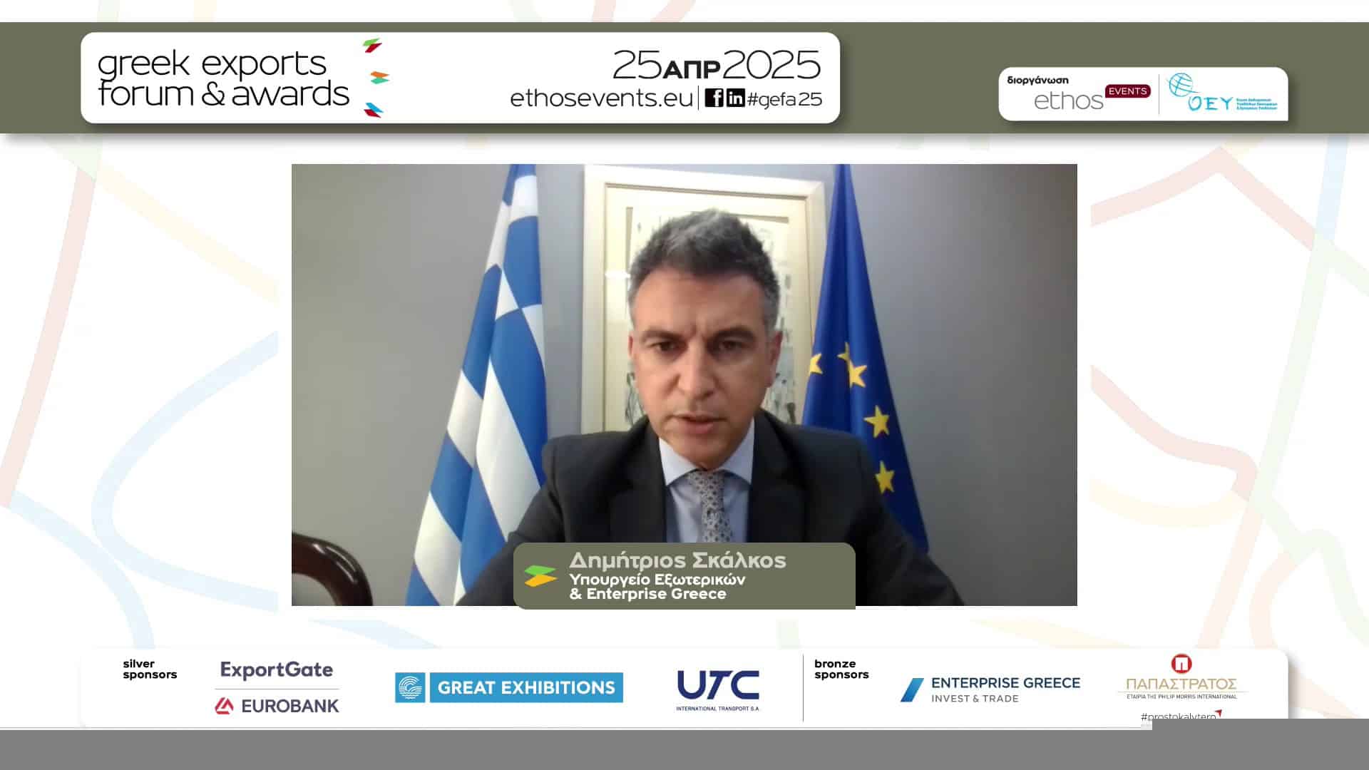 Ο κ. Δημήτριος Σκάλκος, Γενικός Γραμματέας Διεθνών Οικονομικών Σχέσεων & Εξωστρέφειας του Υπουργείου Εξωτερικών, Πρόεδρος της Enterprise Greece, ανέφερε στην τοποθέτησή του: «Οι εξαγωγές έχουν διπλασιαστεί και, το 2024, πλησίασαν τα 50 δισ. ευρώ. Τα τελευταία χρόνια, οι εξαγωγές αγαθών υπερτερούν των εξαγωγών υπηρεσιών. Ο στόχος της προώθησης της εξωστρέφειας υλοποιείται με μια σειρά δράσεων. Η νέα ψηφιακή πλατφόρμα τηλεδιάσκεψης λειτουργεί ήδη πιλοτικά. Υπάρχει νέο σχέδιο εξωστρέφειας. Βαίνει προς ολοκλήρωση ο οδικός χάρτης εμπορίου. Έχει δρομολογηθεί η μετεξέλιξη της Enterprise Greece και η συνεργασία με την ΕΤΕΠ. Παράλληλα, συστήνουμε τα περιφερειακά γραφεία εξωστρέφειας. Λειτουργούν ήδη πιλοτικά στην Περιφέρεια Κεντρικής Μακεδονίας και Ανατολικής Μακεδονίας/Θράκης, Δυτικής Ελλάδας και Ιόνιων Νήσων. Ταυτόχρονα, συστήνεται η κυβερνητική επιτροπή εξωστρέφειας. Είμαι αισιόδοξος για την επόμενη μέρα της εξωστρέφειας της ελληνικής οικονομίας», ανέφερε.