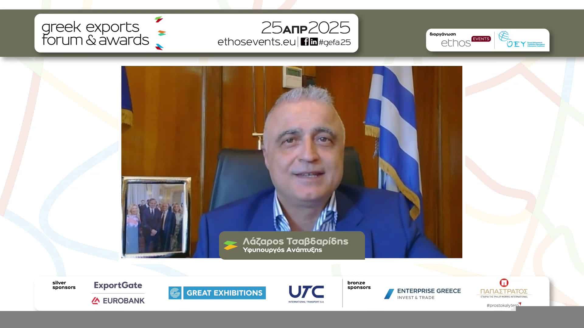 Ο Υφυπουργός Ανάπτυξης, κ. Λάζαρος Τσαβδαρίδης, είπε στον χαιρετισμό του: «Αναγνωρίζουμε και τιμούμε τις επιχειρήσεις που με πάθος και αφοσίωση σφραγίζουν με επιτυχία την παρουσία της Ελλάδας στον παγκόσμιο εμπορικό χάρτη. Οι νέες τάσεις διαμορφώνουν νέο πλαίσιο ευκαιριών. Η αλματώδης τεχνολογική ανάπτυξη, ο ψηφιακός μετασχηματισμός μάς καλούν να εφαρμόσουμε βιώσιμες πρακτικές για επιχειρηματική ανάπτυξη με διορατικότητα και προσαρμοστικότητα. Οι επιχειρήσεις έχουν εξειδίκευση, καινοτομία και κατακτούν νέες αγορές. Η συμβολή τους στην εθνική οικονομία είναι μεγάλη. Η κυβέρνηση της ΝΔ και το Υπουργείο Ανάπτυξης είναι εδώ για να στηρίζουν έμπρακτα τους εξαγωγείς. Με τον αναπτυξιακό, τα 900 εκατ. ευρώ που θα δοθούν για την επιχειρηματικότητα και τη βιομηχανία, με έμφαση τις ακριτικές περιοχές, θα αποτελέσουν σημαντική στήριξη».