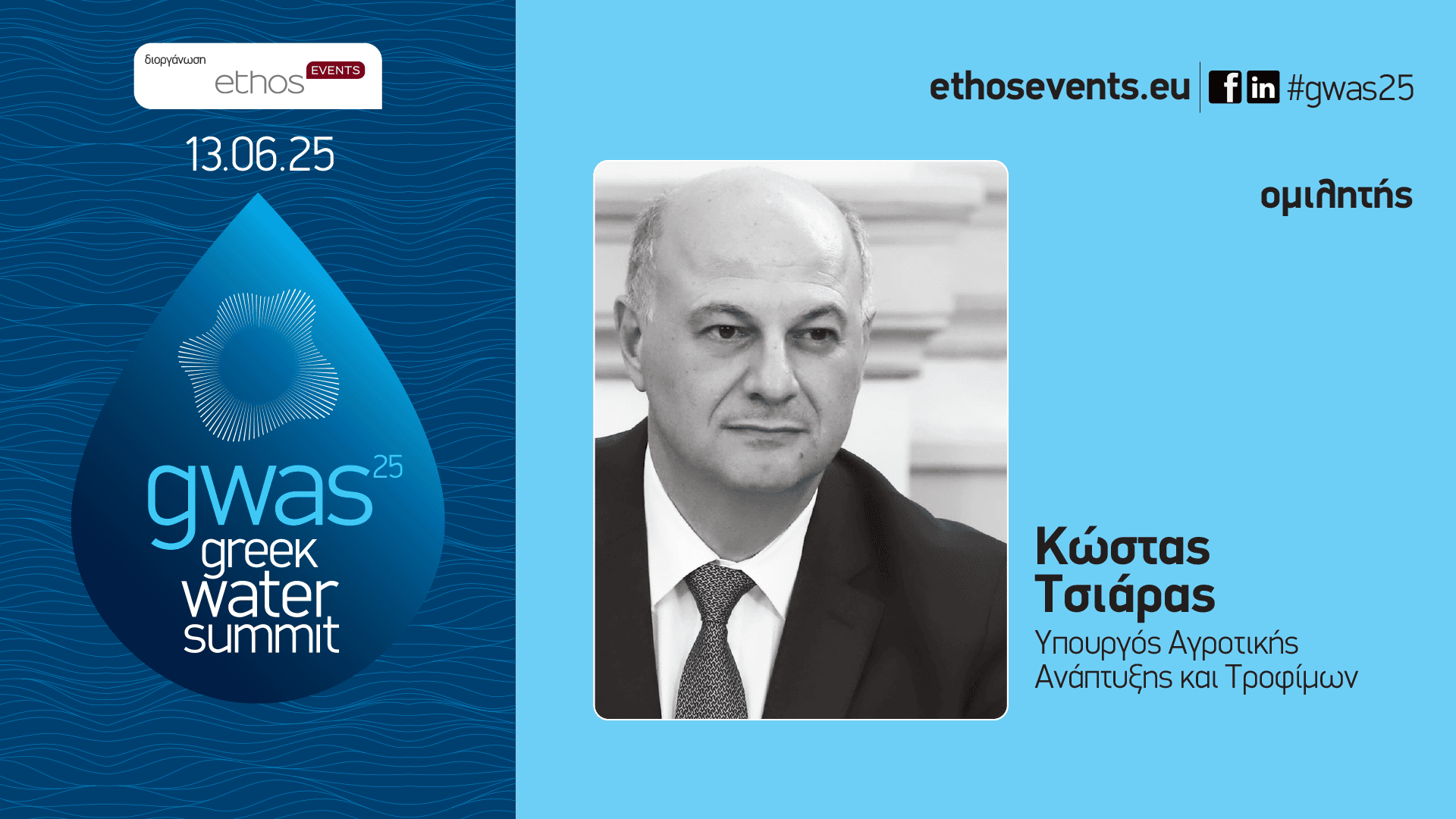Ο υπουργός Αγροτικής Ανάπτυξης και Τροφίμων, κ. Κώστας Τσιάρας, θα συμμετάσχει στο Greek Water Summit 2025, και η παρουσία του αποτελεί κομβικό παράγοντα για την αντιμετώπιση των διεθνών προκλήσεων και την ενίσχυση του τομέα ύδρευσης.