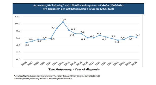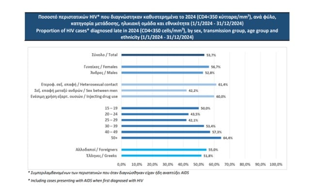 Ο ΕΟΔΥ δημοσίευσε το ετήσιο επιδημιολογικό δελτίο HIV/AIDS για το 2024, καταγράφοντας μείωση 4% στις νέες διαγνώσεις σε σχέση με το 2023. Παρά τη θετική αυτή εξέλιξη, το 53,7% των νέων περιστατικών διαγνώστηκε καθυστερημένα, με υψηλότερα ποσοστά καθυστέρησης στους ετεροφυλόφιλους (61,4%), χρήστες ενδοφλέβιων ουσιών (60%) και άτομα άνω των 50 ετών (64,4%).
