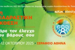 Η σωματική δραστηριότητα και η ισορροπημένη διατροφή αποτελούν θεμέλια μιας ζωής γεμάτης υγεία και χαρά. Με αυτό το μήνυμα, η Συμμαχία για την Καταπολέμηση της Παχυσαρκίας – Action4Obesity διοργανώνει για δεύτερη χρονιά τη Διαδραστική Έκθεση «Πάρε τον Έλεγχο του Βάρους σου», το Σαββατοκύριακο 11 και 12 Οκτωβρίου 2025 στο Σεράφειο του Δήμου Αθηναίων, με ελεύθερη είσοδο για το κοινό.