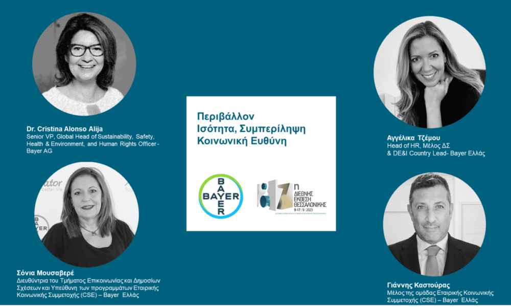 Ηχηρή ήταν η παρουσία της Bayer Ελλάς στην 87η Διεθνή Έκθεση Θεσσαλονίκης. Εκπρόσωποι της εταιρείας συμμετείχαν σε συζητήσεις που αφορούν στην ισότητα, στη συμπερίληψη και στην ενδυνάμωση των γυναικών εντός του εργασιακού χώρου, αλλά και στην προστασία του περιβάλλοντος και στις ευρύτερες προκλήσεις και ευκαιρίες που υπάρχουν στο πλαίσιο των αρχών του ESG.