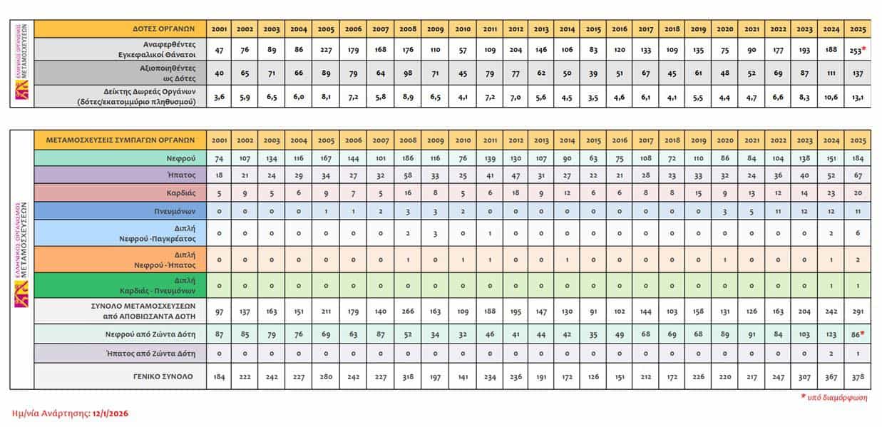 Eντυπωσιακή άνοδος καταγράφεται στον αριθμό των μεταμοσχεύσεων. Το 2025 έκλεισε με μια από τις σημαντικότερες επιδόσεις στην ιστορία των ελληνικών μεταμοσχεύσεων. Από τις 226 μεταμοσχεύσεις οργάνων που πραγματοποιήθηκαν το 2019, η χώρα έφτασε στις 378 το 2025, σημειώνοντας αύξηση 67%.