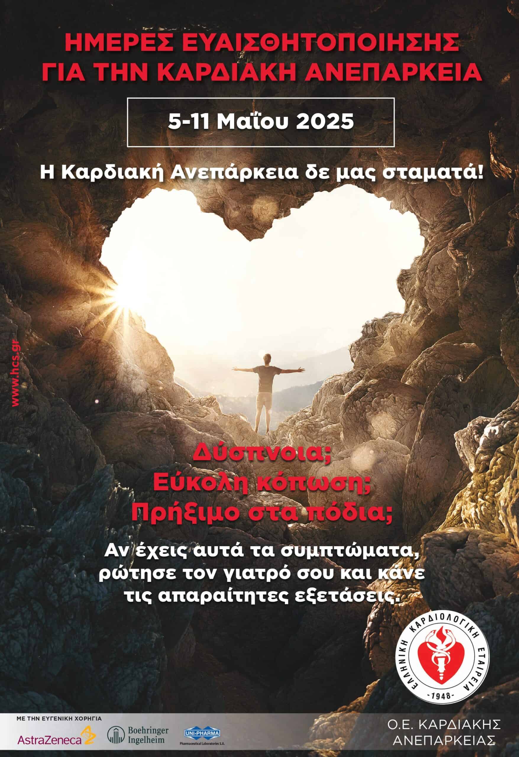 Με μήνυμα «Η Καρδιακή Ανεπάρκεια δε μας σταματά» η Ελληνική Καρδιολογική Εταιρεία υλοποιεί Πανελλήνια Καμπάνια ενημέρωσης και ευαισθητοποίησης πολιτών. Στόχος είναι η αφύπνιση του για την Καρδιακή Ανεπάρκεια.