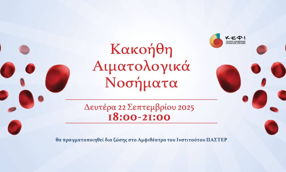 Επιστημονική ημερίδα με θέμα «Κακοήθη αιματολογικά νοσήματα» θα πραγματοποιηθεί την Δευτέρα 22 Σεπτεμβρίου από τον Σύλλογο Καρκινοπαθών, Εθελοντών, Φίλων, Ιατρών «Κ.Ε.Φ.Ι.». Στην ημερίδα θα λάβουν μέρος διακεκριμένοι επιστήμονες ιατροί, από τις μεγαλύτερες Αιματολογικές Κλινικές της χώρας, καθώς και εξέχοντες επιστήμονες του εξωτερικού.