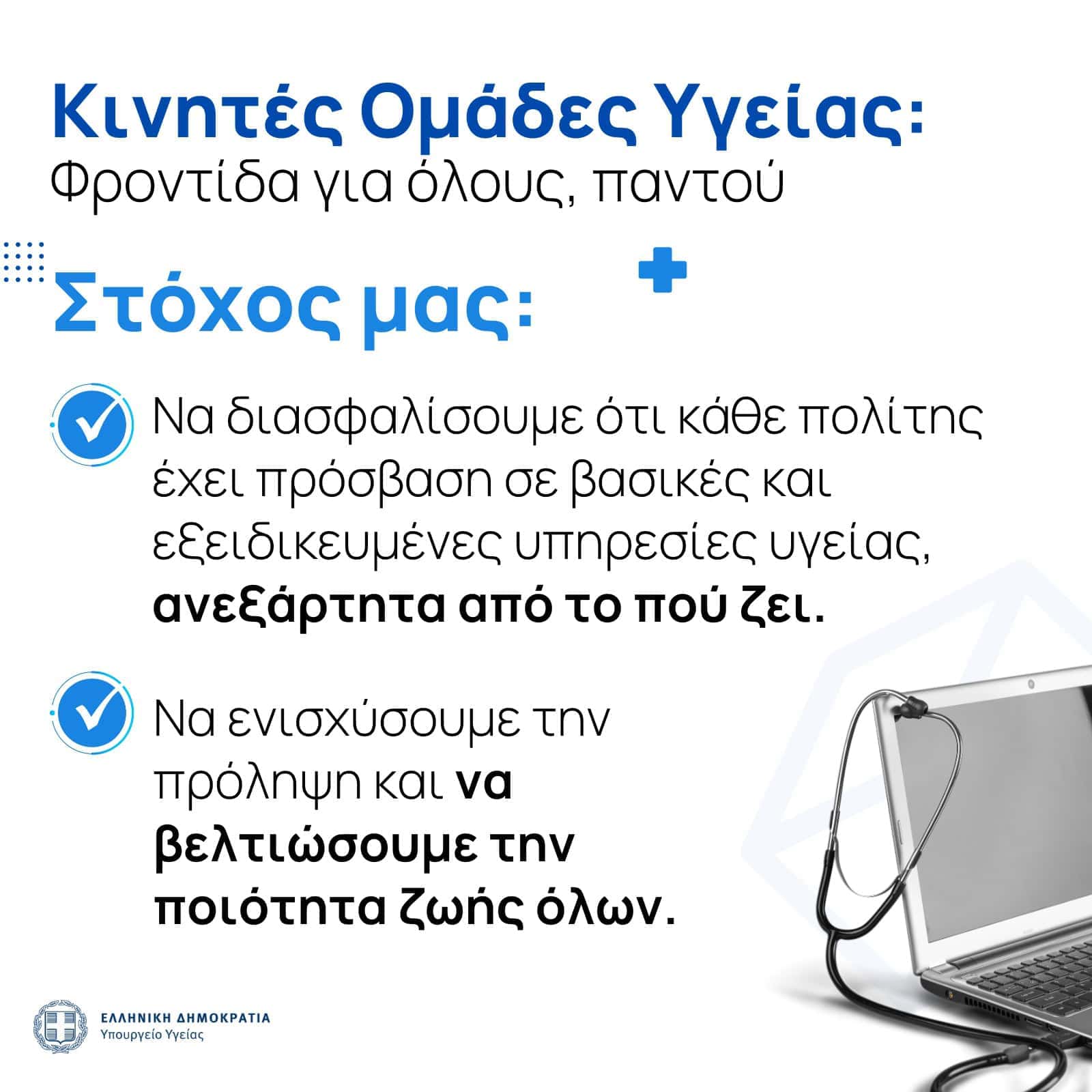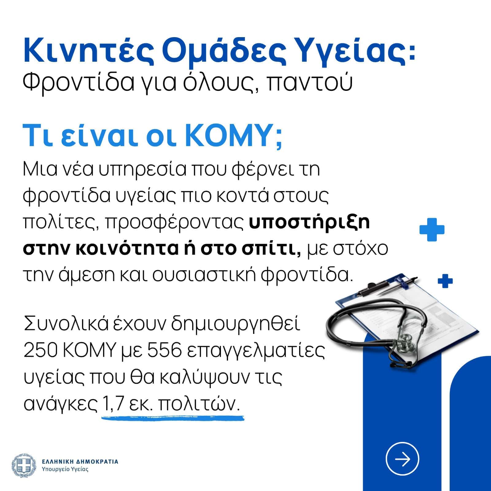 Όπως ανακοίνωσε η αναπληρώτρια υπουργός Υγείας μέσα από τα social media «η φροντίδα υγείας πρέπει να φτάνει σε όλους, όπου κι αν βρίσκονται». Χάρη στις Κινητές Ομάδες Υγείας, η υγειονομική φροντίδα θα φθάνει πιο κοντά σε κάθε πολίτη, ανεξαρτήτως του τόπου διαμονής του. Ήδη έχουν συσταθεί 250 ΚΟΜΥ με 556 επαγγελματίες υγείας που εκτιμάται οτι θα εξυπηρετήσουν συνολικά ανάγκες 1,7 εκ. πολιτών.