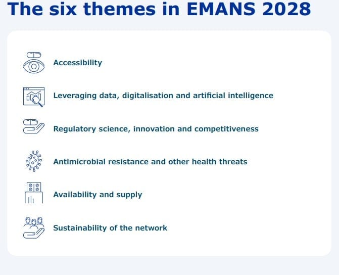 Πρόκειται για μια ολοκληρωμένη επικαιροποίηση της πενταετούς στρατηγικής που αναπτύχθηκε για την περίοδο 2021-2025 (EMANS 2025). Το επικαιροποιημένο έγγραφο θα καθοδηγήσει το ευρωπαϊκό ρυθμιστικό δίκτυο φαρμάκων τα επόμενα έτη. Σκοπός είναι να αντιμετωπίσει τις μελλοντικές προκλήσεις, συμπεριλαμβανομένης της προετοιμασίας και της αντιμετώπισης επειγουσών καταστάσεων και απειλών για τη δημόσια υγεία, όπως η μικροβιακή αντοχή.