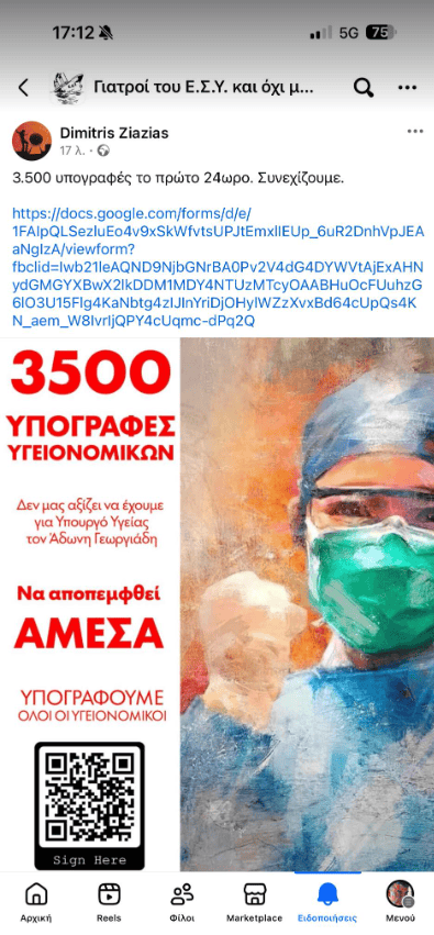 Μια πρωτοβουλία υγειονομικών λαμβάνει διαστάσεις μέσα από διαδικτυακή πλατφόρμα συλλογής υπογραφών, μετά το επεισόδιο που σημειώθηκε στο Γενικό Νοσοκομείο Νίκαιας νοσοκομείο μεταξύ του υπουργού Υγείας Άδωνη Γεωργιάδη και του γιατρού Δημήτρη Ζιαζιά. Το κείμενο, που αναρτήθηκε στο προφίλ του γιατρού, καλεί σε άμεση αποπομπή του υπουργού, καταγγέλλοντας στοχοποίηση, τοξικότητα και κατάχρηση εξουσίας.