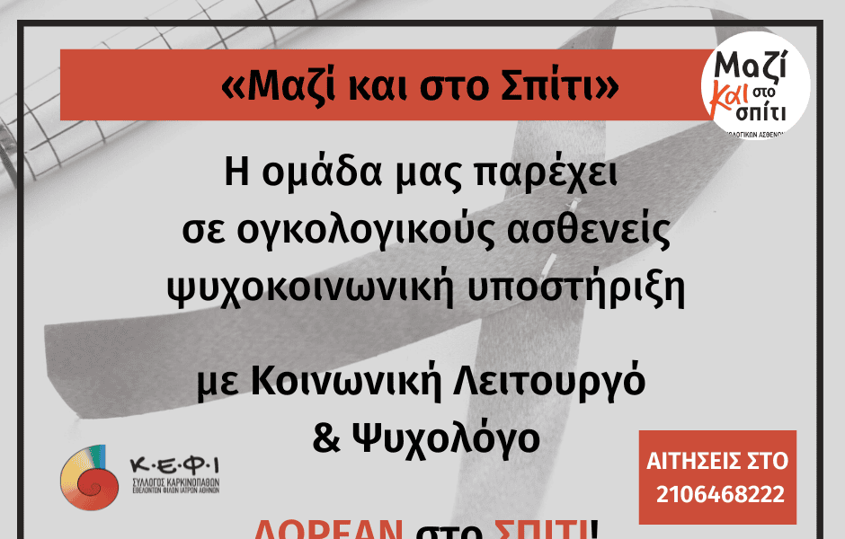Σε μια συνεχή διαδικασία το πρόγραμμα του Συλλόγου Καρκινοπαθών – Εθελοντών – Φίλων – Ιατρών “Κ.Ε.Φ.Ι.” Αθηνών βρίσκεται δίπλα στους ανθρώπους στο σπίτι, προσφέροντας ψυχολογική και κοινωνική υποστήριξη. Κατά το 2023 το πρόγραμμα στηρίζεται οικονομικά από το ΤΙΜΑ Κοινωφελές Ίδρυμα.