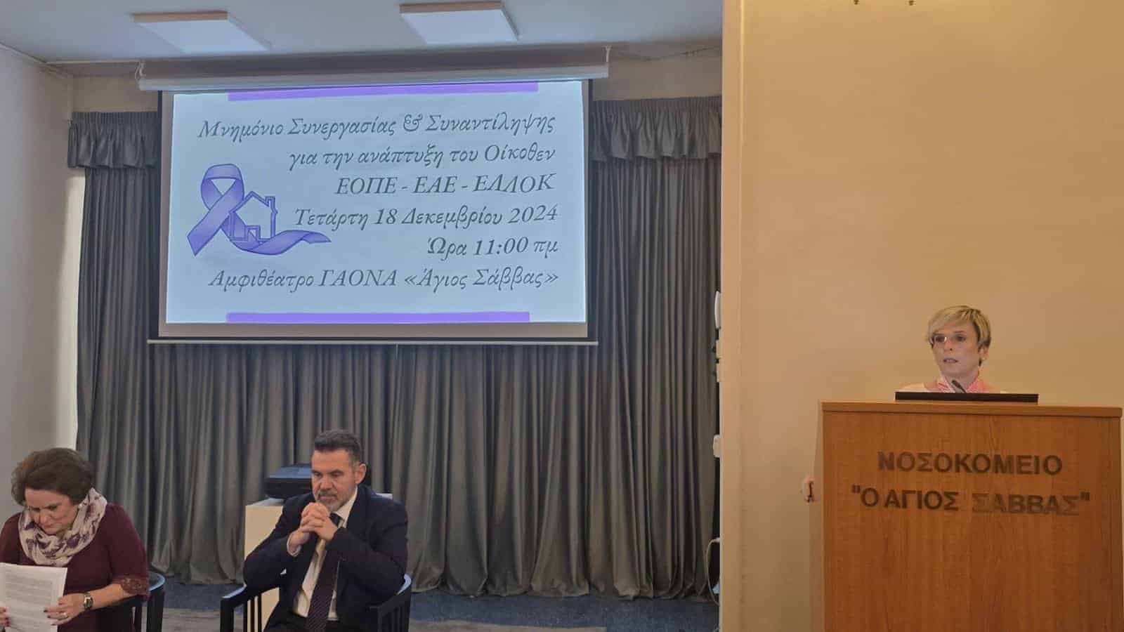Μνημόνιο συνεργασίας και συναντίληψης υπογράφτηκε για την υποστήριξη προγραμμάτων κατ’ οίκον χορήγησης νοσοκομειακής θεραπείας στο πρότυπο του προγράμματος ΟΙΚΟΘΕΝ μεταξύ των ΕΟΠΕ και ΕΛΛΟΚ. Το Μνημόνιο υπογράφθηκε στο αμφιθέατρο του ΓΑΟΝΑ ΑΓ. ΣΑΒΒΑΣ.
