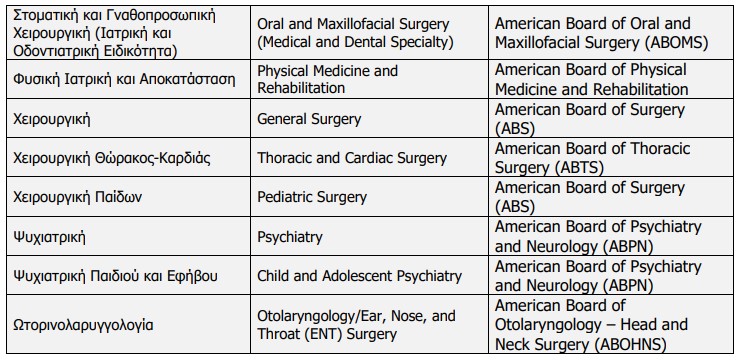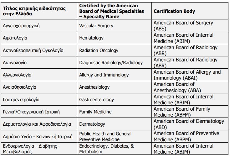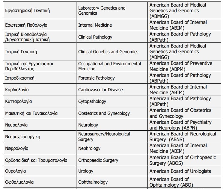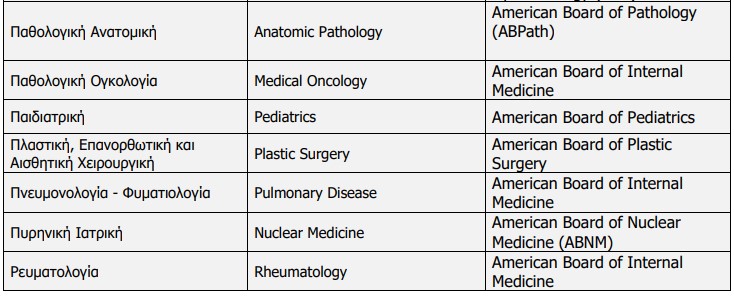 Η αναγνώριση γίνεται σε αντιστοίχιση των τίτλων ιατρικών ειδικοτήτων με τις θεσμοθετημένες στην χώρα μας ειδικότητες, σύμφωνα με τον κάτωθι πίνακα: