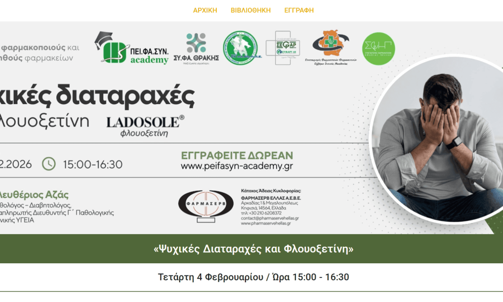 Ένα νέο ενημερωτικό και επιστημονικά τεκμηριωμένο webinar με θέμα «Ψυχικές Διαταραχές και Φλουοξετίνη» διοργανώνεται από τον όμιλο ΠΕΙΦΑΣΥΝ. Η εκδήλωση απευθύνεται σε επαγγελματίες υγείας και εστιάζει στη σύγχρονη φαρμακευτική αντιμετώπιση των ψυχικών διαταραχών, αξιοποιώντας τα πιο πρόσφατα δεδομένα της κλινικής πρακτικής.