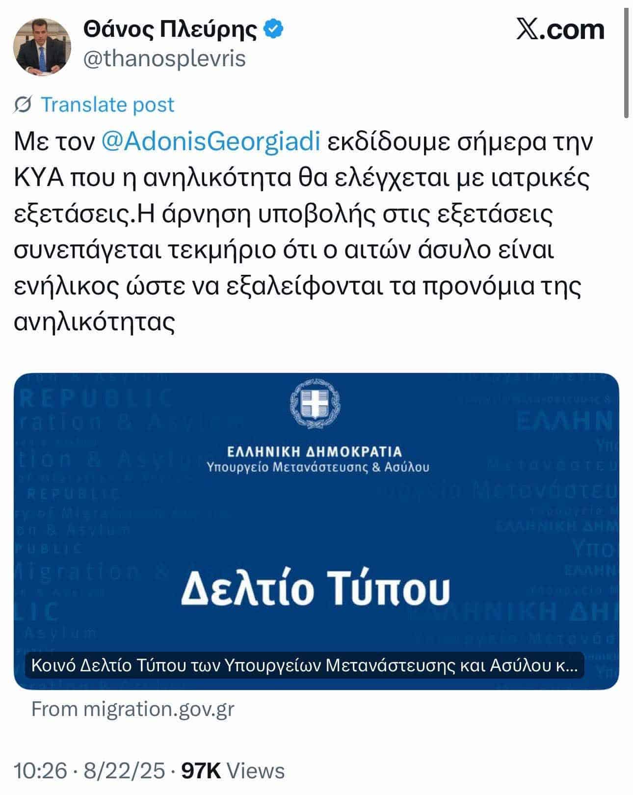 Αναφερόμενος στη νομοθετική ενέργεια ο υπουργός Μετανάστευσης και Ασύλου Θάνος Πλεύρης τόνισε ότι «Η ΚΥΑ διασφαλίζει τον πιο επιστημονικά άρτιο έλεγχο της ηλικίας. Όσοι δηλώνουν ψευδώς ότι είναι ανήλικοι θα έχουν συνέπειες, ενώ η άρνηση συμμετοχής θα θεωρείται τεκμήριο ενηλικότητας». Από την πλευρά του, ο υπουργός Υγείας Άδωνις Γεωργιάδης υποστήριξε ότι «Με τη ρύθμιση αυτή ενισχύεται η δικαιοσύνη και η αποτελεσματικότητα στη διαχείριση των αιτήσεων ασύλου, διασφαλίζοντας διαφάνεια και ορθή καταγραφή».