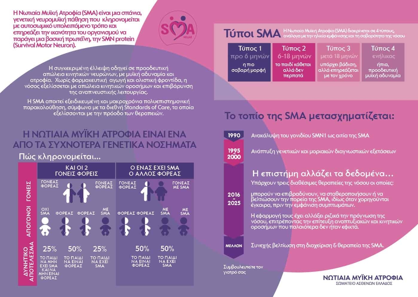 «Η Νωτιαία Μυϊκή Ατροφία (SMA) αποτελεί ένα από τα συχνότερα γενετικά νοσήματα. Στην Ελλάδα, η επίπτωσή της εκτιμάται περίπου σε 1 ανά 12.000 γεννήσεις, γεγονός που αντιστοιχεί σε περίπου 8 νέα περιστατικά ετησίως. Παράλληλα, η συχνότητα των φορέων υπολογίζεται περίπου σε 1 στους 40 ανθρώπους.
