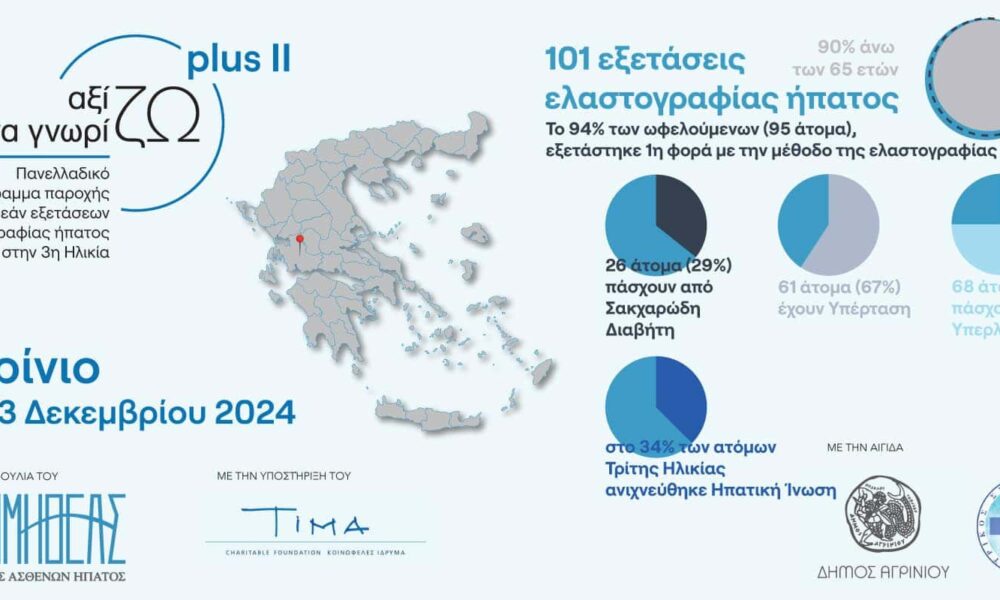 Με μεγάλη ανταπόκριση ολοκληρώθηκε από τον Σύλλογο Ασθενών Ήπατος «Προμηθέας», η δεύτερη δράση του προγράμματος «Αξίζω να Γνωρίζω Plus ΙΙ» για την Τρίτη Ηλικία στο Αγρίνιο. Στο πλαίσιο του προγράμματος παρέχεται η δυνατότητα εξέτασης σε ελαστογραφία ήπατος, που δεν καλύπτεται από τα ασφαλιστικά ταμία.