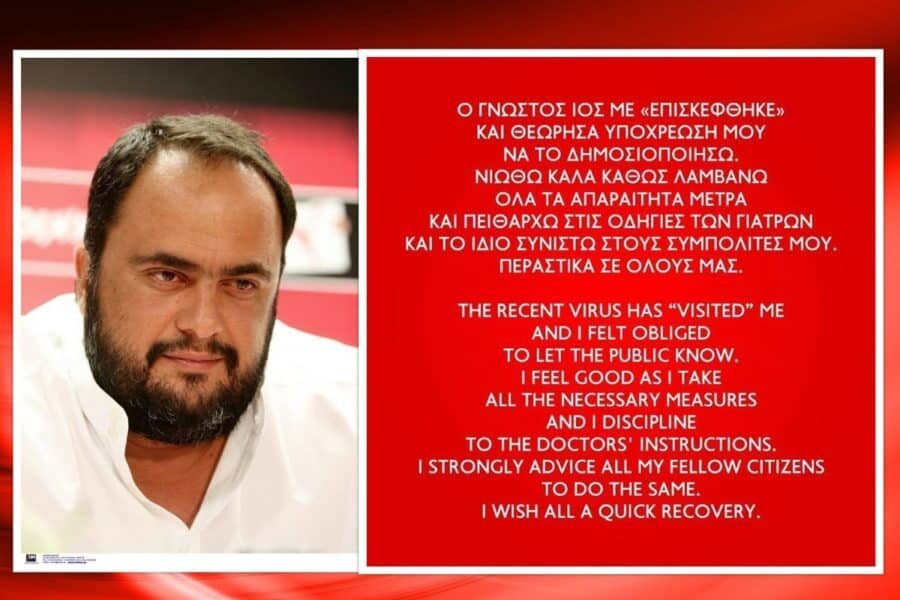 Σε ανάρτησή του σε προσωπική του σελίδα στα social media δήλωσε ότι νοσεί από τον κοροναϊό ο μεγαλομέτοχος της ΠΑΕ Ολυμπιακός, Βαγγέλης Μαρινάκης.