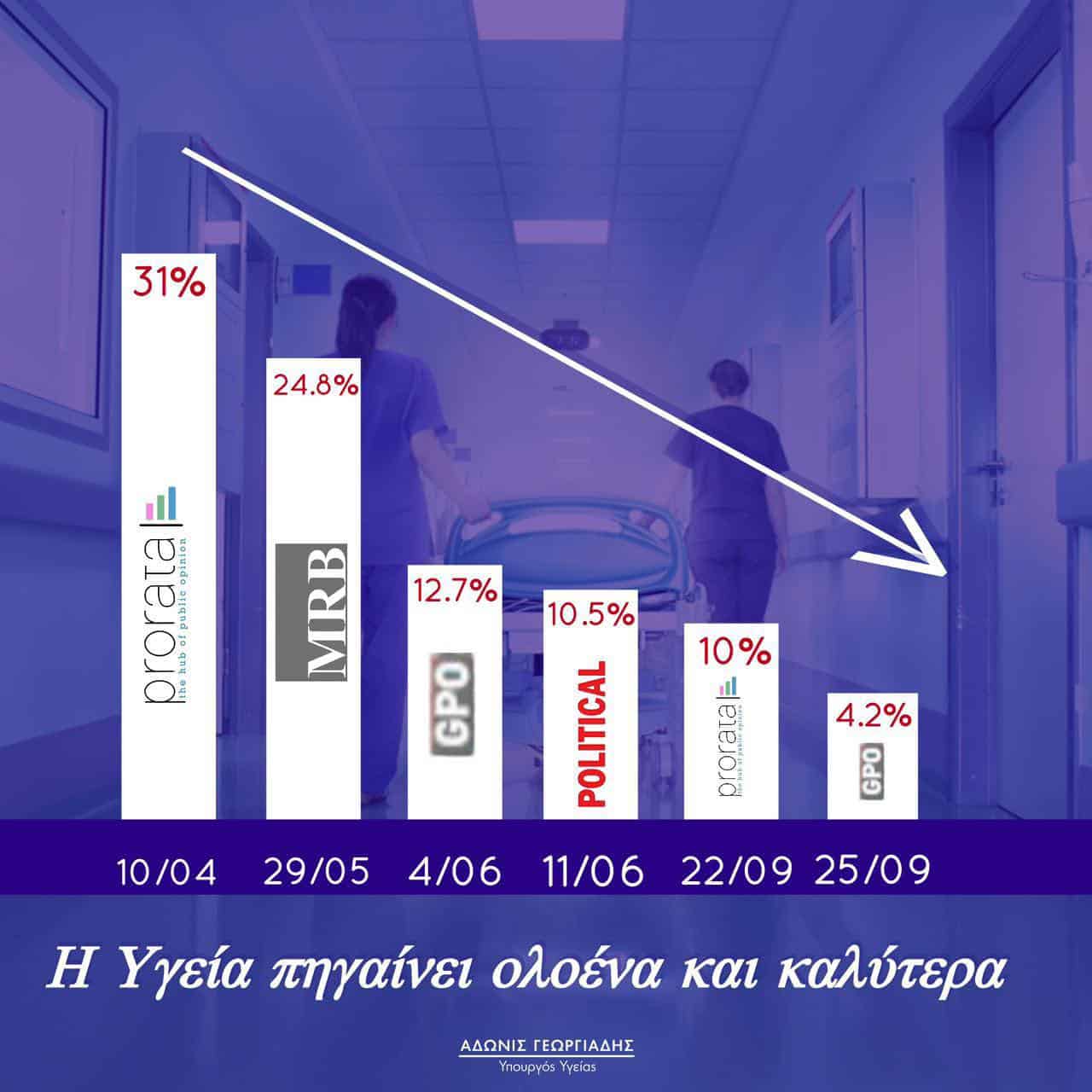Xαρακτηριστικά ο κ. Γεωργιάδης σε ανάρτησή του στα social media ανέφερε ότι «επειδή συχνά μου ζητούν να σχολιάζω τις διάφορες δημοσκοπήσεις, μου κάνει εντύπωση ότι κανείς δεν με ρώτησε για το πιο σημαντικό εύρημα των τελευταίων δημοσκοπήσεων, όσον αφορά στο Υπουργείο Υγείας. Σε όλες τις εταιρείες δημοσκοπήσεων, ανεξαρτήτως αριθμών, η Υγεία ως πρόβλημα μειώνεται και πέφτει σταθερά ως τέτοιο κατά την εκτίμηση των πολιτών. Αυτό συμβαίνει παρά την προπαγάνδα των ΜΜΕ που όλη μέρα παρουσιάζουν ένα δήθεν ΕΣΥ που καταρρέει… Προχωράμε. Το ΕΣΥ άλλαξε και έγινε καλύτερο.»