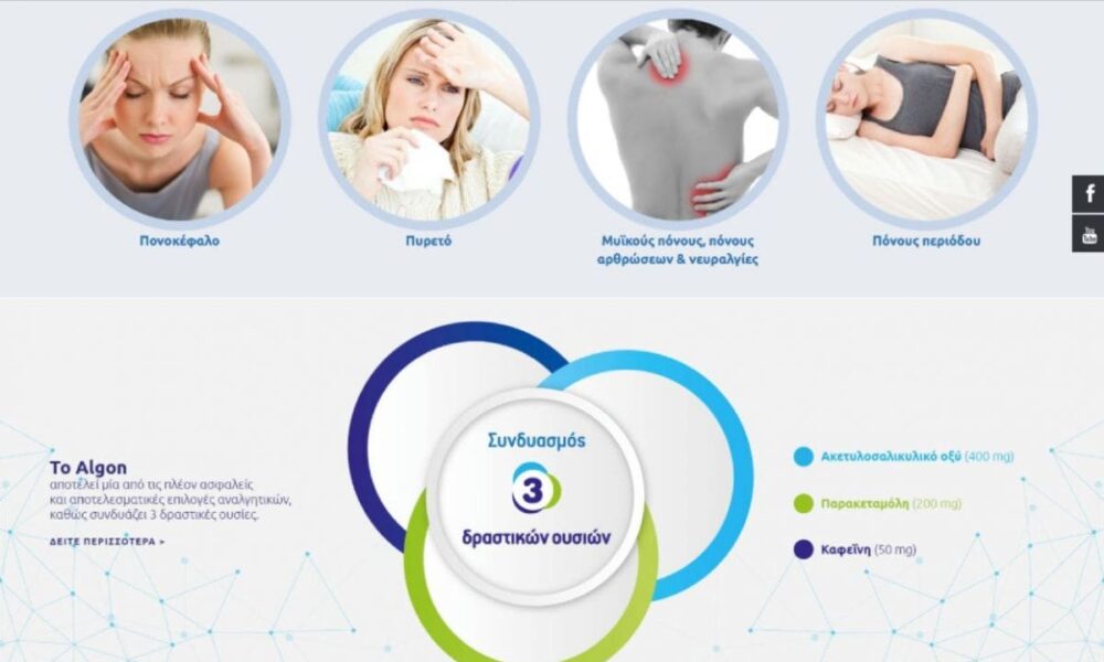 Ολοκληρωμένη και εύκολα προσβάσιμη online ενημέρωση σχετικά με τις ιδιότητες και τα χαρακτηριστικά του Algon®, όπως και για θέματα που αφορούν στις διάφορες μορφές πόνου – την πρόληψη, την αντιμετώπιση και την ανακούφισή τους – προσφέρει η νέα ιστοσελίδα του ιστορικού ελληνικού αναλγητικού-αντιπυρετικού, που αναρτήθηκε πρόσφατα στο διαδίκτυο από τη φαρμακευτική εταιρεία Valeant/PharmaSwiss Hellas.