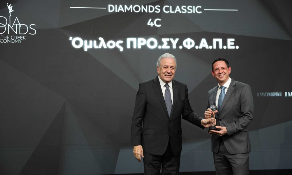Νωρίτερα μέσα στο Δεκέμβριο, βραβεύτηκε ξανά ως ένα από τα Διαμάντια της ελληνικής οικονομίας στην σχετική τελετή της εφημερίδας ΝΑΥΤΕΜΠΟΡΙΚΗ, που αποτελεί πλέον θεσμό. Το 4C Diamonds Award που παρέλαβε ο Όμιλος ΠΡΟΣΥΦΑΠΕ αντιπροσωπεύει διάκριση μεταξύ των 200 πρώτων εταιρειών, βάσει του κύκλου εργασιών και το αποτέλεσμα του συνδυασμού των αριθμοδεικτών μικτού και καθαρού περιθωρίου κέρδους.