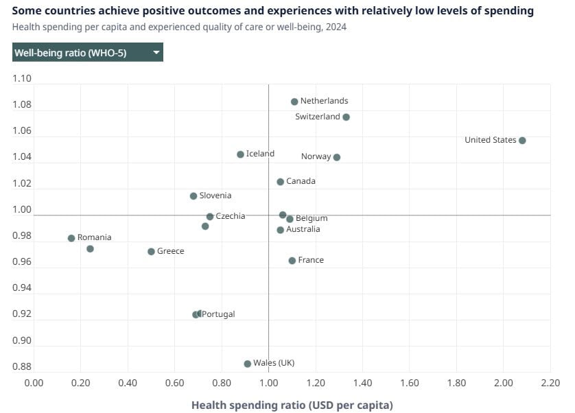 Οι περισσότεροι άνθρωποι αναφέρουν θετικές εμπειρίες περίθαλψης και καλύτερα αποτελέσματα υγείας, σε σύγκριση με τον μέσο όρο του ΟΟΣΑ, στην Ελβετία και στις Ηνωμένες Πολιτείες, εστιάζοντας στον πληθυσμό ηλικίας 65 ετών και άνω στο Medicare. Στην Αυστραλία, την Τσεχία, τη Γαλλία και τη Νορβηγία, οι περισσότεροι άνθρωποι αναφέρουν επίσης θετικές εμπειρίες και αποτελέσματα της περίθαλψης. Χώρες με βαθμολογίες κάτω του μέσου όρου σε περισσότερους από τους μισούς δείκτες είναι η Ελλάδα, η Ισλανδία, η Πορτογαλία, η Ρουμανία και η Ουαλία (Ηνωμένο Βασίλειο).
