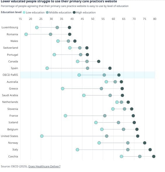 Οι ηλικιωμένοι και οι λιγότερο μορφωμένοι άνθρωποι δυσκολεύονται να κατανοήσουν τις πληροφορίες για την υγεία και έχουν λιγότερη εμπιστοσύνη στη χρήση της ψηφιακής τεχνολογίας για τη διαχείριση της υγείας τους από ό,τι οι νεότεροι και οι άνθρωποι με υψηλό μορφωτικό επίπεδο. Στην Ισλανδία, την Αυστραλία, τη Γαλλία, την Ουαλία, τον Καναδά, την Τσεχία και την Ελβετία, οι πιο μορφωμένοι έχουν τουλάχιστον 10 ποσοστιαίες μονάδες μεγαλύτερη πιθανότητα να διαθέτουν αυτοπεποίθηση στη χρήση πληροφοριών υγείας από το διαδίκτυο. Επιπλέον, κατά μέσο όρο τα άτομα με υψηλό μορφωτικό επίπεδο έχουν 26 ποσοστιαίες μονάδες περισσότερες πιθανότητες να δηλώσουν ότι ο δικτυακός τόπος του ιατρείου πρωτοβάθμιας περίθαλψης είναι εύχρηστος. Επομένως, είναι σημαντικό να διευκολύνουμε όλους τους ανθρώπους να κατανοούν, να χρησιμοποιούν και να περιηγούνται στους ιστότοπους και τα ψηφιακά εργαλεία υγείας