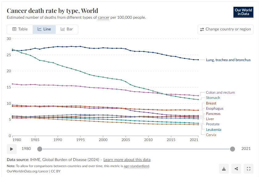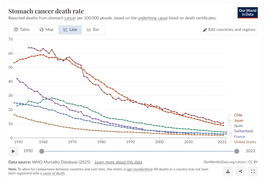 Ένα χαρακτηριστικό παράδειγμα είναι ο καρκίνος του στομάχου, ο οποίος κάποτε ήταν από τις κυριότερες αιτίες θανάτου στις ΗΠΑ. Το 2021, ο δείκτης θνησιμότητας ήταν περίπου εννέα φορές χαμηλότερος σε σχέση με το 1950.