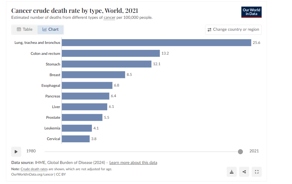 Ο καρκίνος του πνεύμονα, του παχέος εντέρου, του στομάχου και του μαστού είναι οι κυριότερες αιτίες θανάτου από καρκίνο διεθνώς. Τα στοιχεία προέρχονται από το Institute for Health Metrics and Evaluation (IHME), το οποίο συνδυάζει δεδομένα από ληξιαρχεία, μητρώα καρκίνου, νοσοκομεία και λεκτικές νεκροψίες, εφαρμόζοντας στατιστικά μοντέλα για χώρες με ελλιπή στοιχεία. Ο καρκίνος του πνεύμονα έχει το υψηλότερο ποσοστό θανάτων, κυρίως λόγω του καπνίσματος.