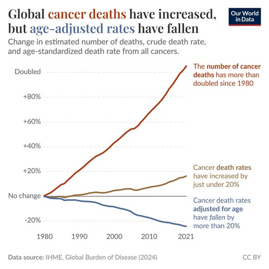 Ο καρκίνος εμφανίζεται συχνότερα σε μεγαλύτερες ηλικίες, επομένως περισσότερος και γηραιότερος πληθυσμός σημαίνει αναπόφευκτα περισσότερα περιστατικά και θανάτους. Σύμφωνα με τα στοιχεία, η εξέλιξη των θανάτων από καρκίνο αποτυπώνεται σε τρεις διαφορετικούς δείκτες: