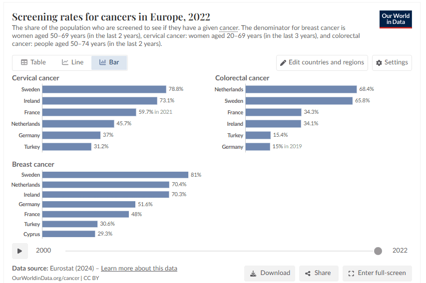 Στα εργαλεία αυτά περιλαμβάνονται η μαστογραφία για τον καρκίνο του μαστού, το τεστ Παπανικολάου και ο έλεγχος HPV για τον καρκίνο του τραχήλου της μήτρας, καθώς και η κολονοσκόπηση για τον καρκίνο του παχέος εντέρου.