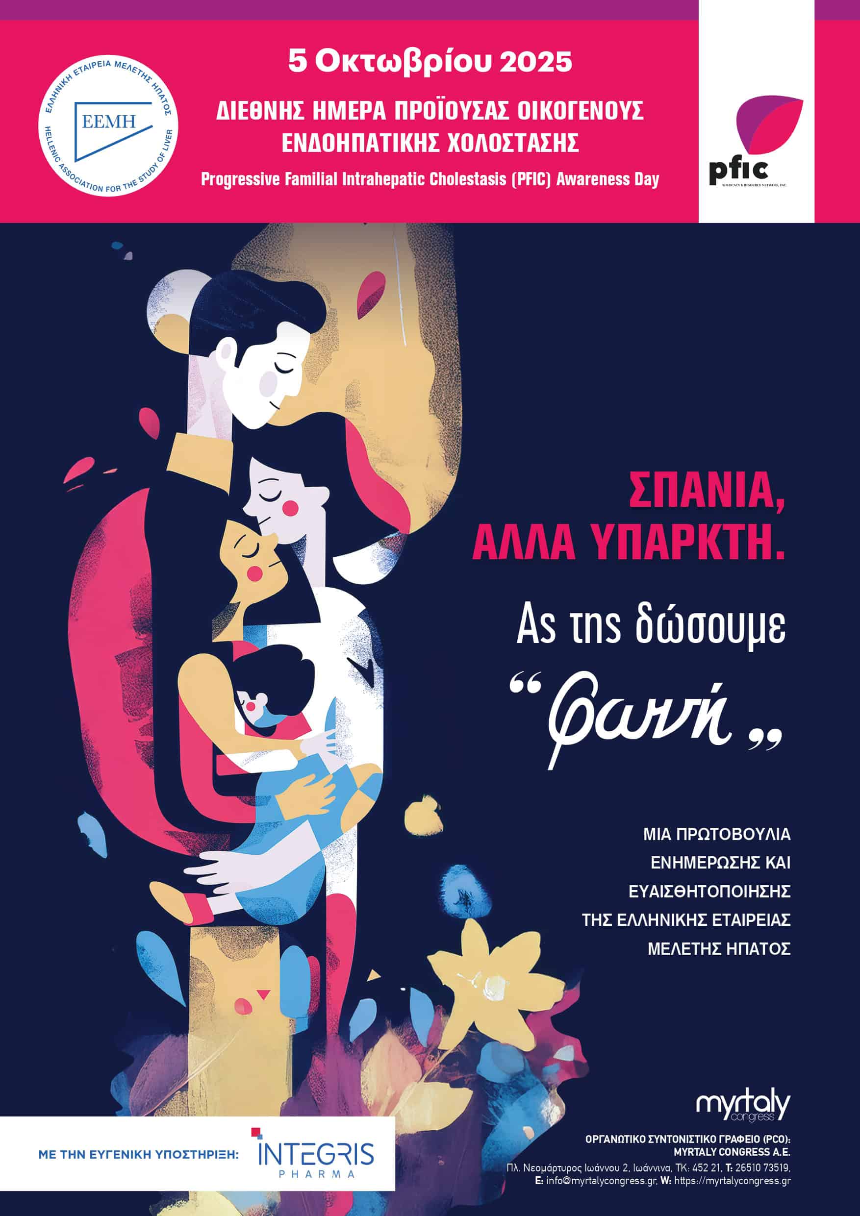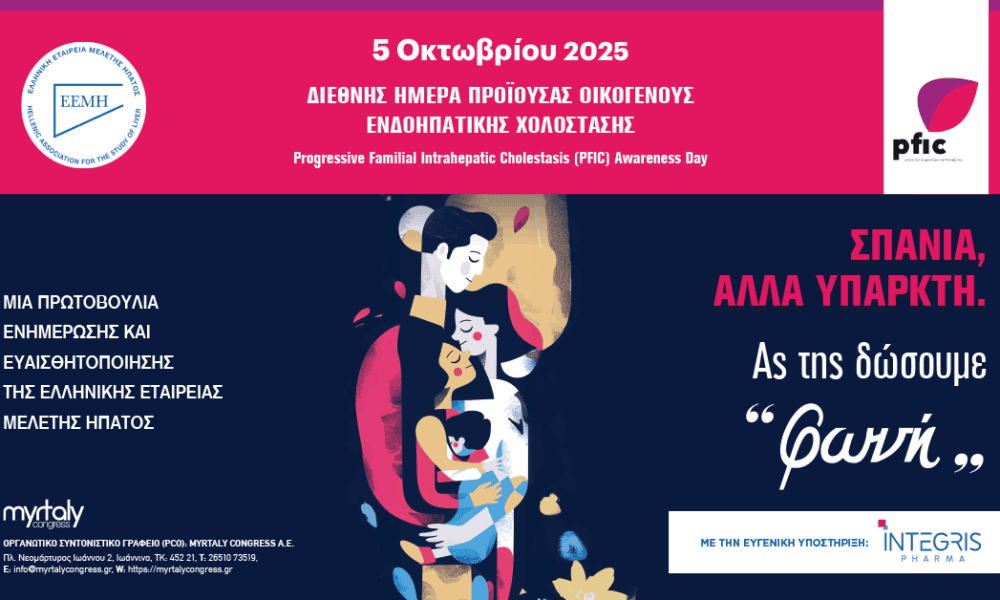 Η Ελληνική Εταιρεία Μελέτης Ήπατος (ΕΕΜΗ) συμμετείχε στις 5 Οκτωβρίου 2025 στην Παγκόσμια Ημέρα Προϊούσας Οικογενούς Ενδοηπατικής Χολόστασης (PFIC), αναδεικνύοντας τη σημασία της ενημέρωσης και της έγκαιρης διάγνωσης για μια σπάνια αλλά σοβαρή ηπατική πάθηση που επηρεάζει κυρίως παιδιά.