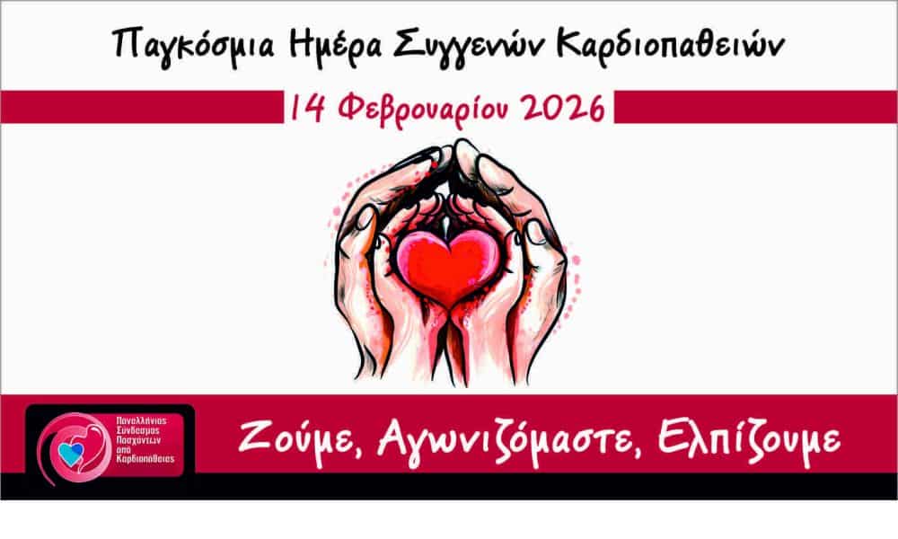 Την αφύπνιση του κοινού επιχειρεί ο Πανελλήνιος Σύνδεσμος Πασχόντων με Καρδιοπάθειες με αφορφή τον εορτασμό το Σάββατο 14 Φεβρουαρίου 2026 της Παγκόσμιας Ημέρας για τις Συγγενείς Καρδιοπάθειες. Η ημέρα αναδεικνύει τον ασθενοκεντρικό χαρακτήρα της σύγχρονης φροντίδας και υπενθυμίζει την ανάγκη συνεχούς υποστήριξης για χιλιάδες ανθρώπους που ζουν με συγγενείς καρδιοπάθειες.