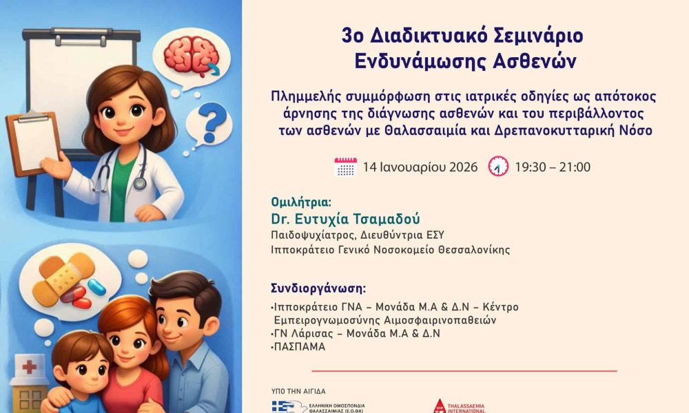 Το διαδικτυακό σεμινάριο διοργανώνεται από τον Πανελλήνιο Σύλλογο Πασχόντων από Μεσογειακή Αναιμία & Δρεπανοκυτταρική Νόσο (ΠΑΣΠΑΜΑ), το Κέντρο Εμπειρογνωμοσύνης Αιμοσφαιρινοπαθειών της Μονάδας Μ.Α & Δ.Ν του Ιπποκρατείου Γ.Ν.Α και τη Μονάδα Μ.Α & Δ.Ν του Γενικού Νοσοκομείου Λάρισας. Η δράση εντάσσεται σε μια ευρύτερη προσπάθεια συνεχούς ενημέρωσης και υποστήριξης των ασθενών με χρόνιες αιματολογικές παθήσεις.