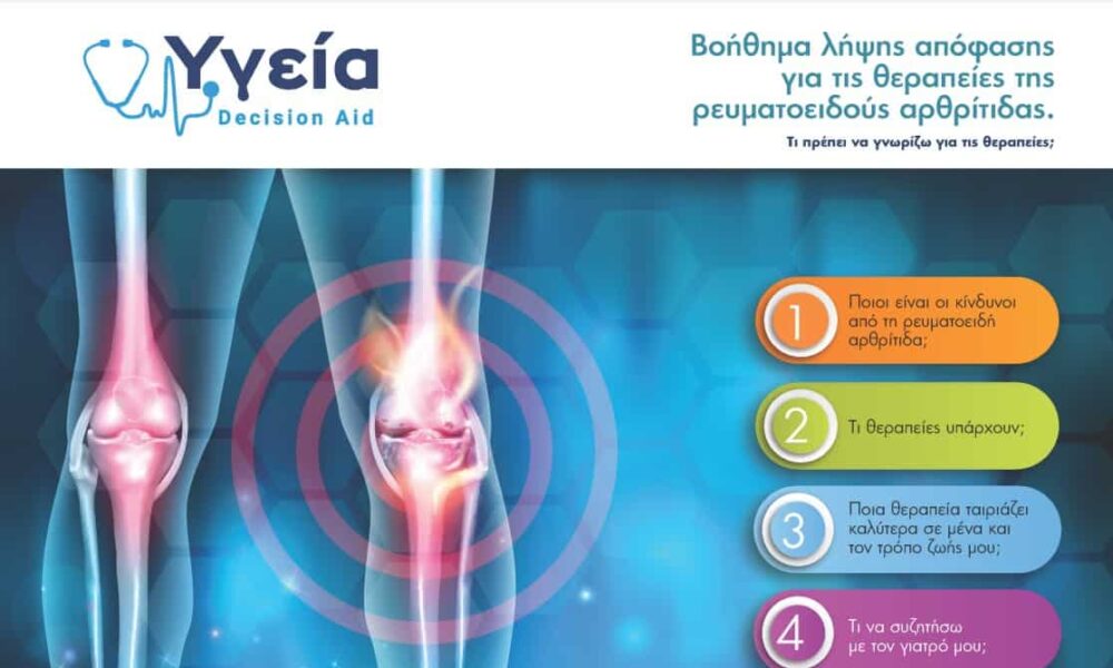 Το πρώτο στην Ελλάδα βοήθημα λήψης απόφασης για ασθενείς με Ρευματοειδή Αρθρίτιδα διατίθεται από το Τμήμα Πολιτικών Δημόσιας Υγείας. Στόχος είναι η ενίσχυση και η βελτίωση ποιότητας ζωής των ασθενών με ρευματοειδή αρθρίτιδα.