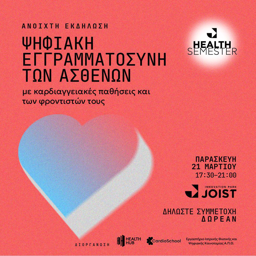 Συγκεκριμένα, η εκδήλωση θα πραγματοποιηθεί την Παρασκευή 21 Μαρτίου 2025, 17:30 – 21:00 στο JOIST. Η συνεχής εξέλιξη των ψηφιακών τεχνολογιών προσφέρει νέες δυνατότητες για την υποστήριξη των ασθενών με καρδιαγγειακές παθήσεις, τόσο στην παρακολούθηση της υγείας τους, όσο και στη βελτίωση της ποιότητας ζωής τους. Επιδίωξη  είναι να δώσει την ευκαιρία στους ασθενείς με καρδιαγγειακά νοσήματα να γνωρίσουν τις δυνατότητες που προσφέρουν οι νέες τεχνολογίες και τους τρόπους πιθανής αξιοποίησης αυτών, προς διευκόλυνση της καθημερινότητάς τους.