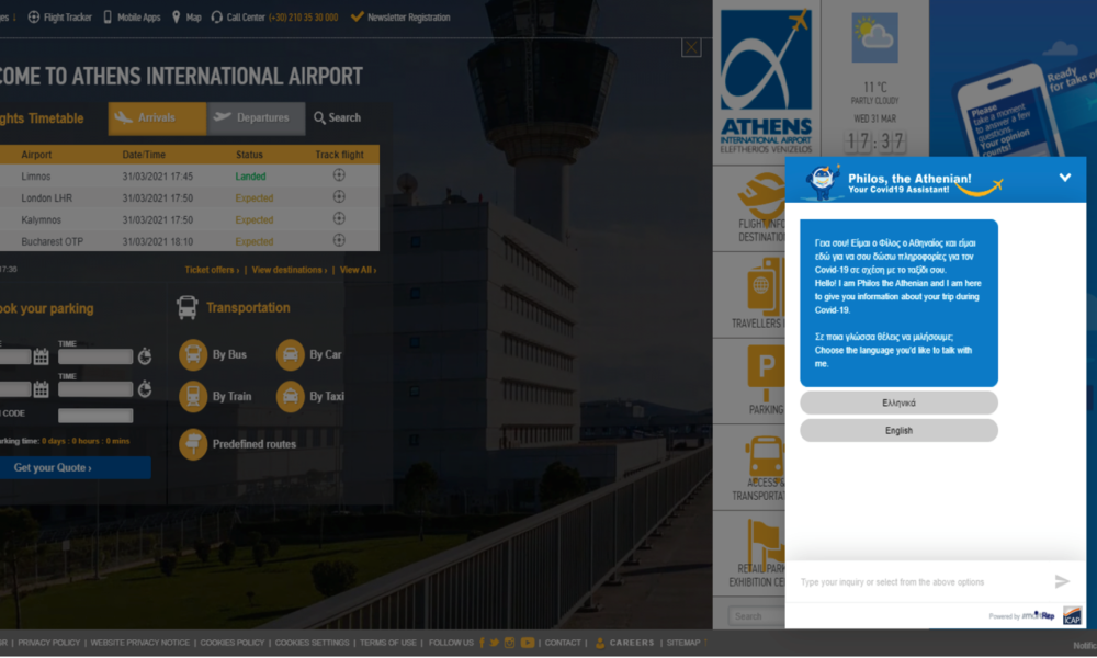 Από «ψηφιακό βοηθό» θα μπορούν να αντλούν πληροφορίες οι επιβάτες για ταξίδια με ασφάλεια εν μέσω πανδημίας COVID-19 στο Διεθνές Αερολιμένα Αθηνών. Με στόχο την ενημέρωση και την περιφρούρηση ενός ακίνδυνου ταξιδιού αξιοποιείται η τεχνητή νοημοσύνη σε ένα πιλοτικό πρόγραμμα.