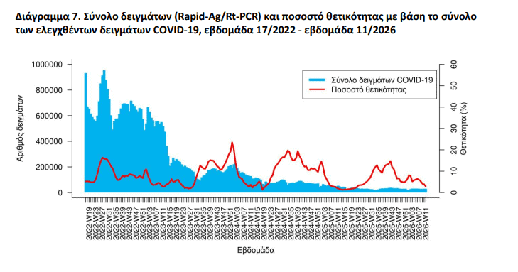 Η θετικότητα των διαγνωστικών ελέγχων για SARS-CoV-2 παραμένει χαμηλή πανελλαδικά, παρουσιάζοντας μικρή πτώση.