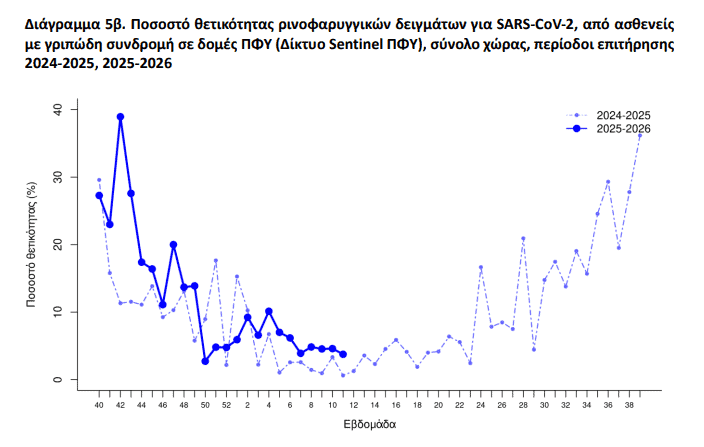 Η θετικότητα για γρίπη στην κοινότητα συνεχίζει να μειώνεται και την εβδομάδα 11/2026 υποχώρησε κάτω από το όριο του 10%, που σηματοδοτεί την εποχική δραστηριότητα.