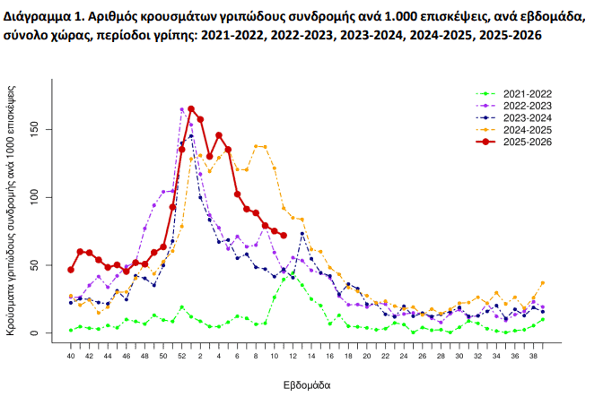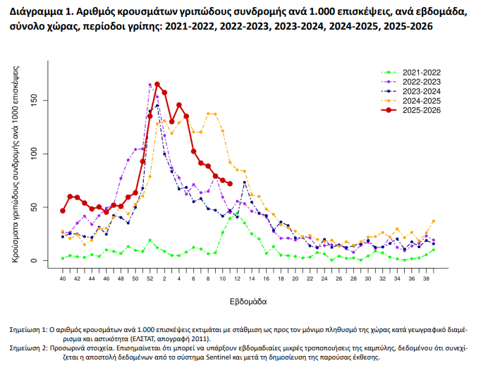 Συνεχίζεται η αποκλιμάκωση της γριπώδους συνδρομής (ILI), με τον αριθμό κρουσμάτων ανά 1.000 επισκέψεις να μειώνεται περαιτέρω την εβδομάδα 11/2026, συνεχίζοντας την πτωτική πορεία που άρχισε από την εβδομάδα 4/2026. Αντίστοιχη εικόνα παρουσιάζει και η σοβαρή οξεία λοίμωξη αναπνευστικού (SARI), η οποία παραμένει σε χαμηλά επίπεδα, με νέα μείωση σε σχέση με την προηγούμενη εβδομάδ, σύμφωνα με την έκθεση του ΕΟΔΥ.