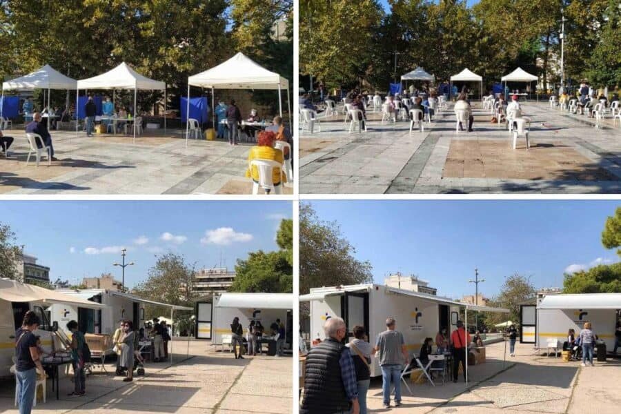 Ακόμη, υγειονομικοί του ΕΟΔΥ αποτελούμενα με την συμβολή Κινητών Ομάδων Υγείας έκαναν rapid τεστ σε πολίτες, στην πλατεία Νέας Σμύρνης στην Αττική.