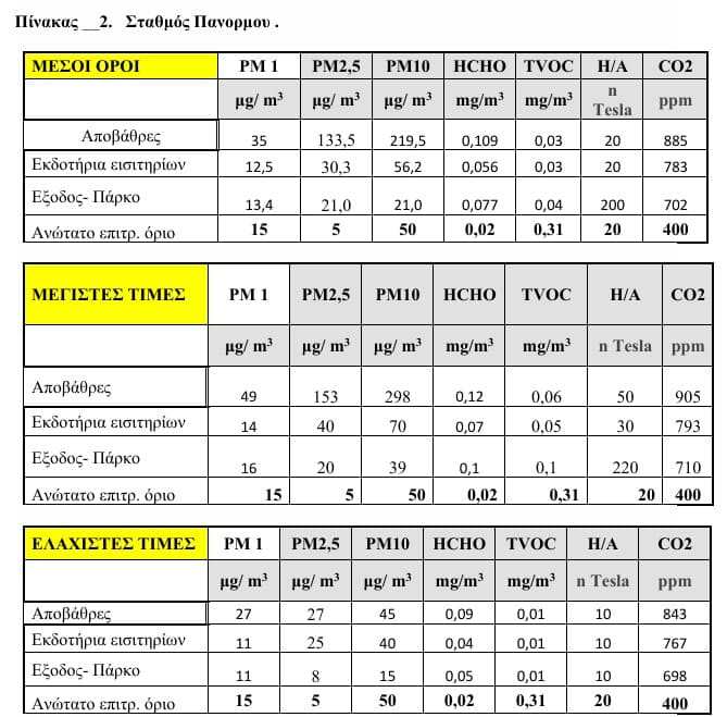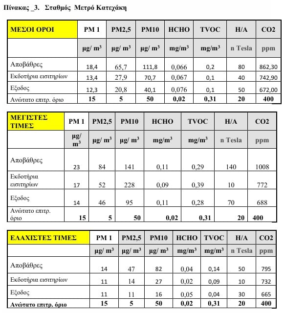 Σύμφωνα με τα αναλυτικά στοιχεία των μετρήσεων της 17ης Ιουνίου, καταγράφηκαν ιδιαίτερα υψηλές συγκεντρώσεις μικροσωματιδίων (PM2.5 και PM10), διοξειδίου του αζώτου (NO₂) και μαγγανίου, με τιμές που υπερβαίνουν κατά 150% έως 300% τα θεσπισμένα ευρωπαϊκά όρια. Οι υπερβάσεις σημειώθηκαν σε όλους τους ελεγχόμενους σταθμούς, με τις αποβάθρες να εμφανίζουν τη μεγαλύτερη συγκέντρωση ρύπων, λόγω έλλειψης αερισμού και επανακυκλοφορίας αιωρούμενης σκόνης από τη φθορά των φρένων και των γραμμών. Οι ειδικοί τονίζουν ότι η μακροχρόνια έκθεση σε τέτοιες συνθήκες αυξάνει τον κίνδυνο αναπνευστικών και καρδιαγγειακών νοσημάτων, ειδικά για ευάλωτες ομάδες πληθυσμού, όπως ηλικιωμένοι, παιδιά και άτομα με άσθμα.