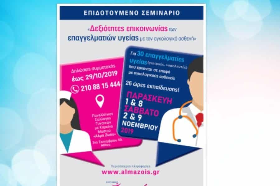 Ευκαιρία για την απόκτηση δεξιοτήτων επικοινωνίας, ένα απαραίτητο εργαλείο για τους επαγγελματίες που έρχονται σε επαφή με ογκολογικούς ασθενείς, προσφέρει ο Πανελλήνιος Σύλλογος Γυναικών με Καρκίνο Μαστού «Άλμα Ζωής» με την διοργάνωση για 3η χρονιά επιδοτούμενο σεμιναρίου. Το πρόγραμμα «Δεξιότητες επικοινωνίας των επαγγελματιών υγείας με τον ογκολογικό ασθενή» περιλαμβάνει εκπαίδευση 26 ωρών.