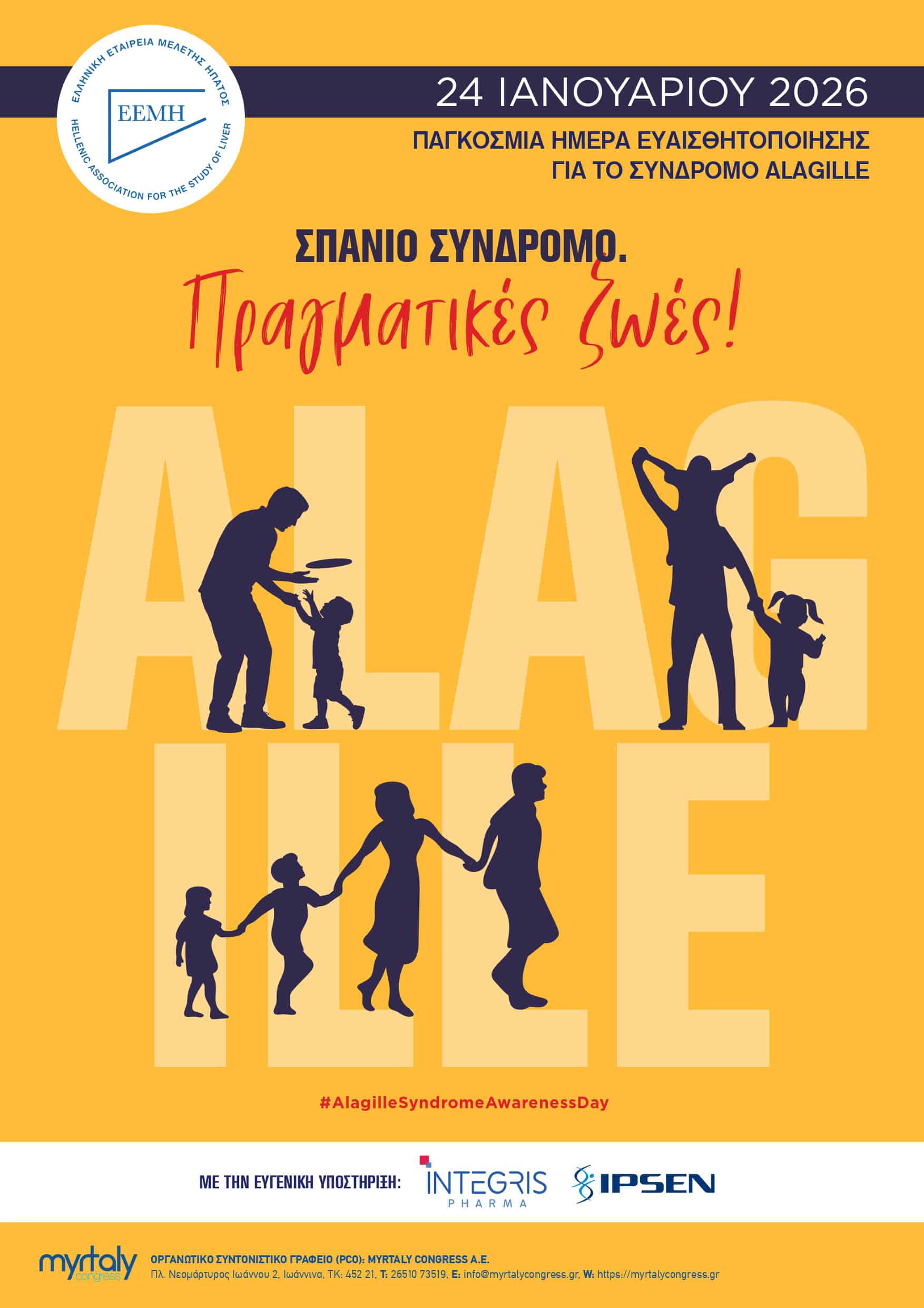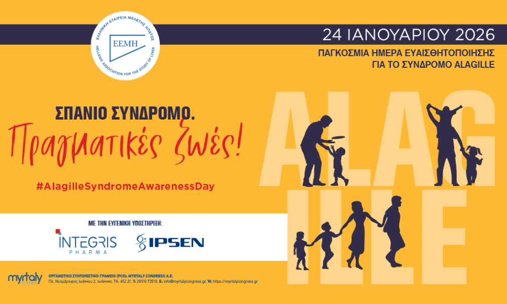 Η Ελληνική Εταιρεία Μελέτης του Ήπατος (ΕΕΜΗ) παρουσιάζει νέα καμπάνια ενημέρωσης για το Σύνδρομο Alagille, με αφορμή την Παγκόσμια Ημέρα Ευαισθητοποίησης που έχει οριστεί για τις 24 Ιανουαρίου 2026. Με σύνθημα «Σπάνιο Σύνδρομο. Πραγματικές ζωές!», η πρωτοβουλία στοχεύει να αναδείξει τις ανάγκες των ασθενών και τη σημασία της έγκαιρης διάγνωσης.