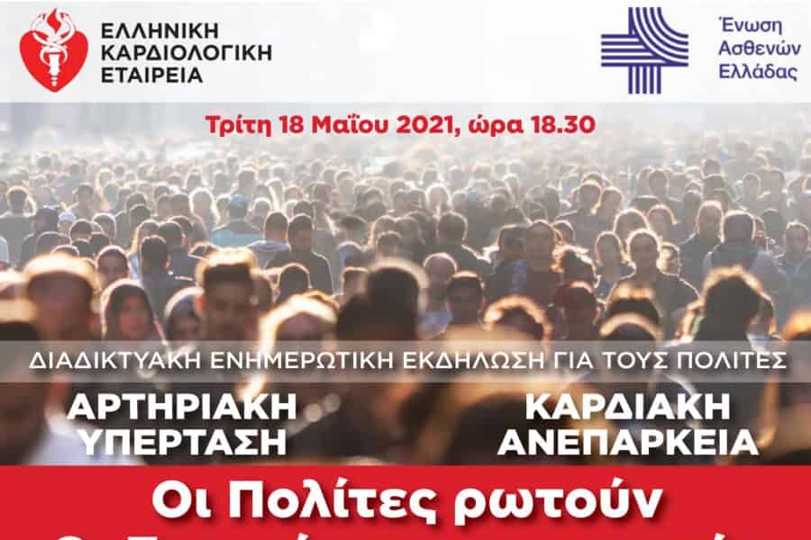 Η Ελληνική Καρδιολογική Εταιρεία «συμμάχησε» με την Ένωση Ασθενών Ελλάδας για την διοργάνωση διαδικτυακής ενημερωτικής εκδήλωσης με θέμα «Καρδιακή Ανεπάρκεια και Αρτηριακή Πίεση».