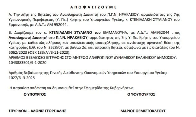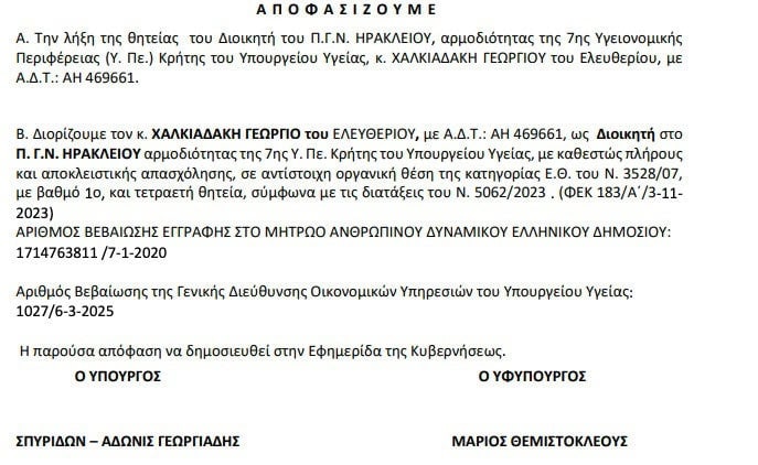 Την απόφαση αυτή υπογράφουν ο υπουργός και ο υφυπουργός Υγείας Μάριος Θεμιστοκλέους σε ΦΕΚ , σύμφωνα με το cretapost.gr . Στο δε Βενιζέλιο Νοσοκομείο ορίστηκε διοικητής ο Κωνσταντίνος Δανδουλάκης, πρώην αναπληρωτής διοικητής στα νοσοκομεία Ρεθύμνου και Χανίων.